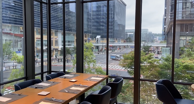 저희가 묵은 룸의 창 밖 뷰는 아무래도 건물이 옆에 보여서 탁 트인 전경은 아니었어요. 그래도 저 멀리 보이는 정자나 내려다 보이는 까페 풍경이 나쁘지 않았고 다음 날 조식을 먹으러 내려가니 통창으로 보이는 전경이 좋아서 전체적으로 만족스러웠어요. 언제나처럼 룸에서 커피 한 잔 하고 TV도 보고 몇 시간 보내다 저녁을 먹으러 호텔 1층으로 내려갔습니다.