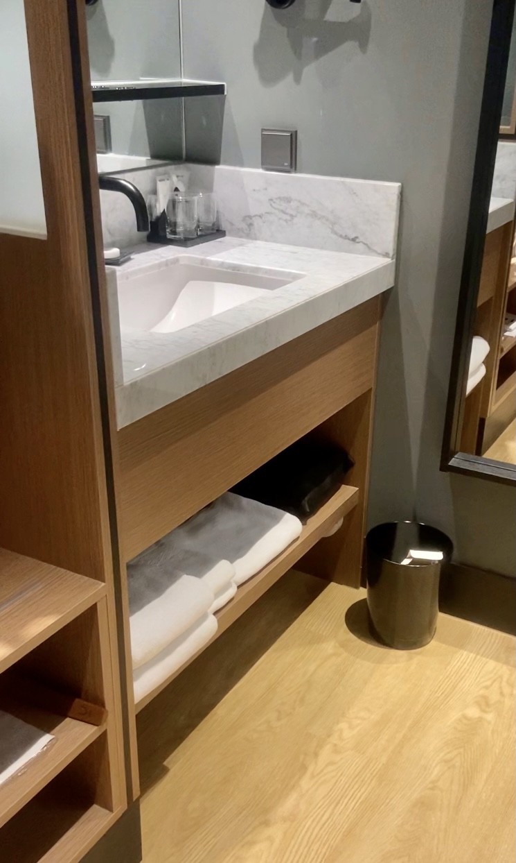 룸은 사진과 같이 톤 다운된 그린과 레드로 꾸며져 있었어요. 룸이 큰 편은 아니었지만 화장실 쪽이 사용하기 편하게 잘 꾸며져 있어서 돌아다닐 때 동선이 괜찮았어요. 화장실의 세면대가 룸의 일부로 나와 있었고 욕실은 따로 샤워부스로 꾸며져 있었거든요. 어메니티는 1회용이 아니었고 침구가 폭신하고 편안했어요.