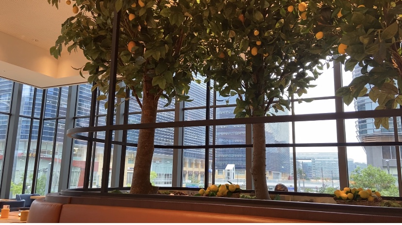 8시 반 즈음 조식을 먹으러 호텔 2층의 Andish 레스토랑으로 향했어요. 식당에 들어서면 한쪽 전면이 통창이어서 탁 트인 느낌이 시원했습니다. 조식 메뉴들도 아기자기한 느낌으로 놓여져 있었고 식당의 가운데 사진과 같이 나무 장식이 있어서 공간이 지루한 느낌이 없었어요. 창 밖의 고층 건물들마저 호텔의 모던한 느낌을 더해주는 풍경으로 보이기도 했어요.
