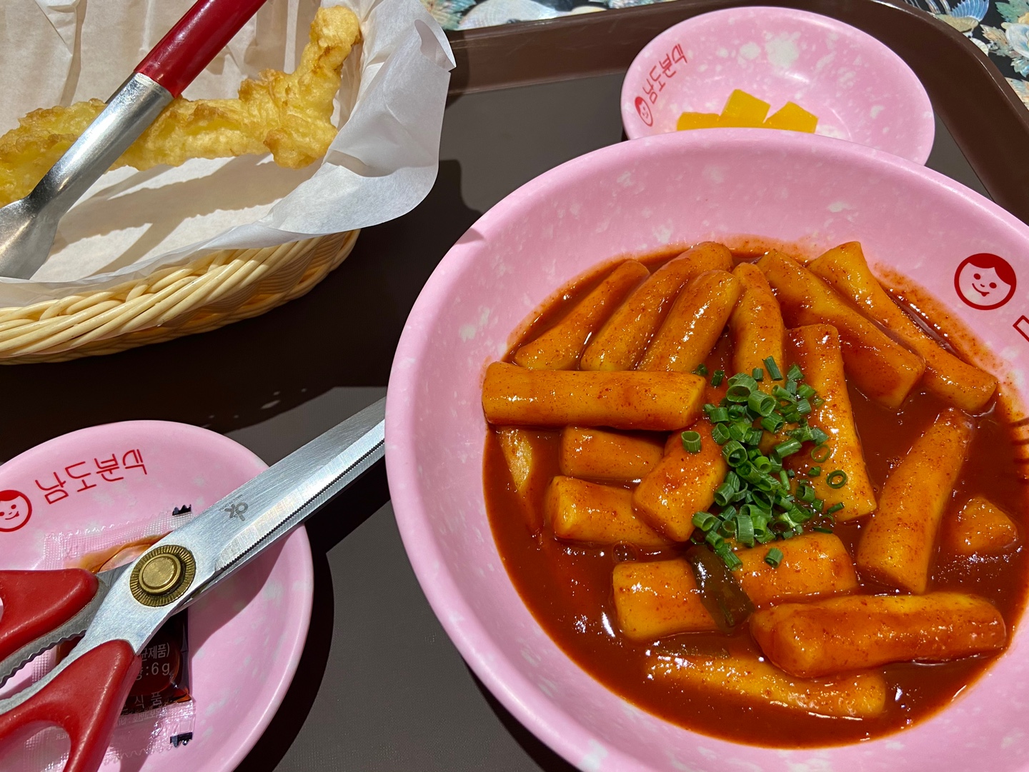조식 외에도 다른 날 먹었던 남도분식 떡볶이가 맛있는 간식이었어요. 음식의 맛이 제일 중요하겠지만 음식을 담는 그릇도 맛있어 보이도록 한 몫을 하는 것 같아요. 남도분식 분홍색 그릇이 귀엽고 매콤한 떡볶이에 금방 튀긴 오징어 튀김을 같이 먹었어요.