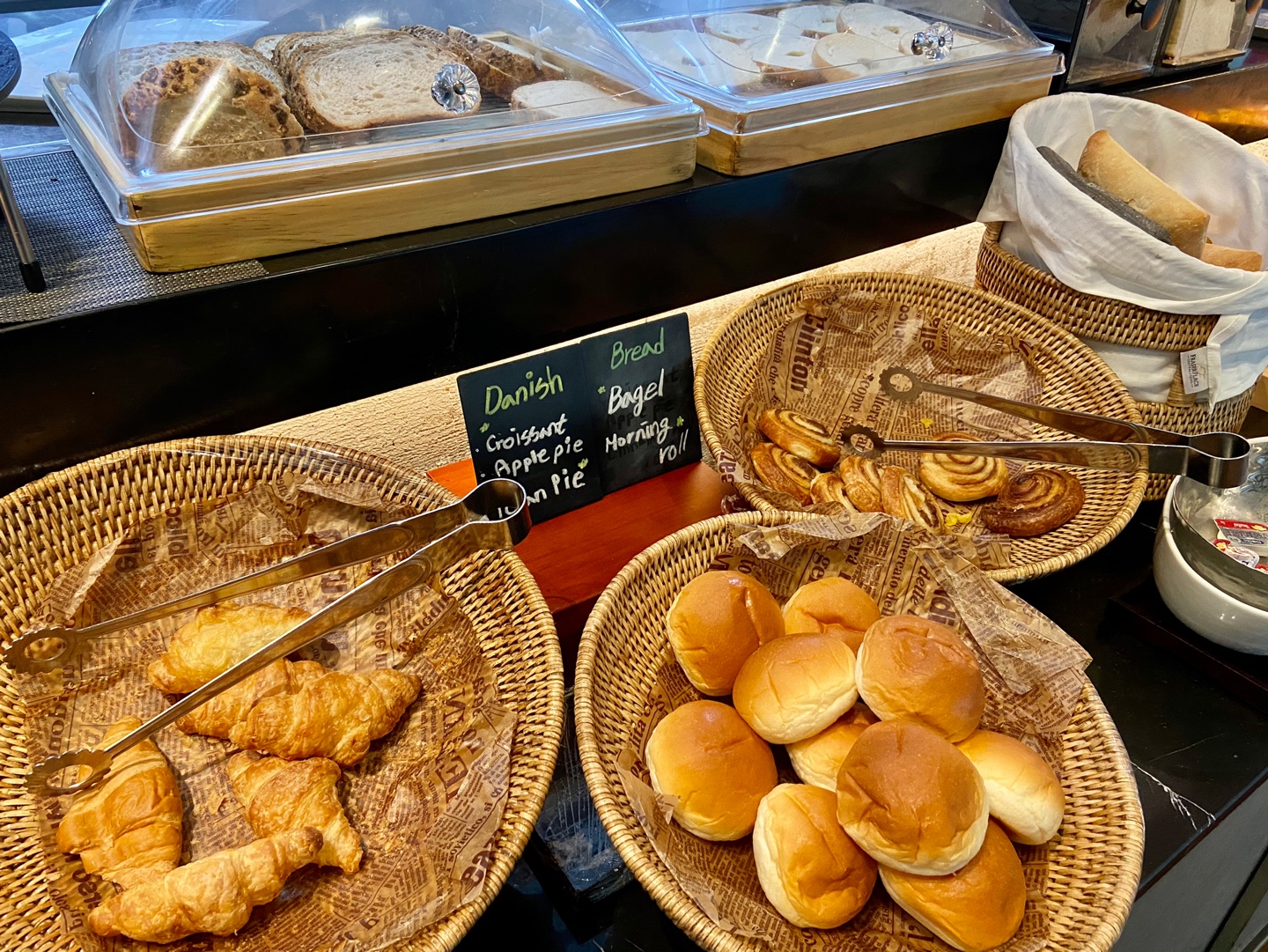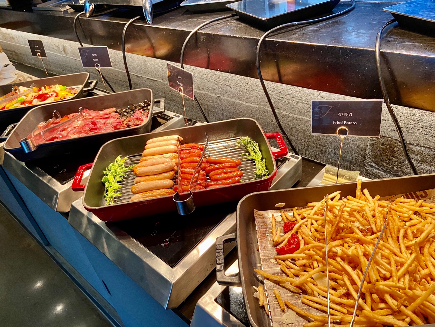 저는 빵을 이것 저것 맛보는 것을 좋아해서 작은 크기의 크로아상과 모닝롤이 있는 점이 좋았어요. 빵과 함께 기본 샐러드, 과일, 한식 반찬 등도 있구요. 조식에서 빼놓을 수 없는 베이컨, 소시지, 계란 종류도 먹음직스럽게 놓여 있어요. 평소에 베이컨을 찾아서 먹지는 않는데 조식에 가면 꼭 챙겨 먹게 되어요.