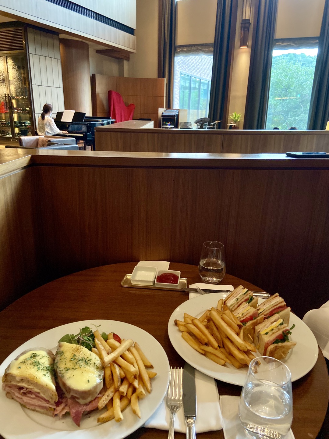 신라 호텔 하면 1층 천장에 전시된 반짝이는 조형물과 망고 빙수가 유명한 더 라이브러리가 유명한 것 같아요. 저희는 예전에 망고 빙수 대신 다른 빙수를 먹었던 적만 있어요. 더 라이브러리에서는 클럽 샌드위치에 다른 메뉴를 하나 더 시켜서 먹는 것을 좋아해요. 다른 호텔에 갈 때도 클럽 샌드위치는 꼭 먹어보는 편인데 신라 호텔 샌드위치가 제일 맛이 있어요.