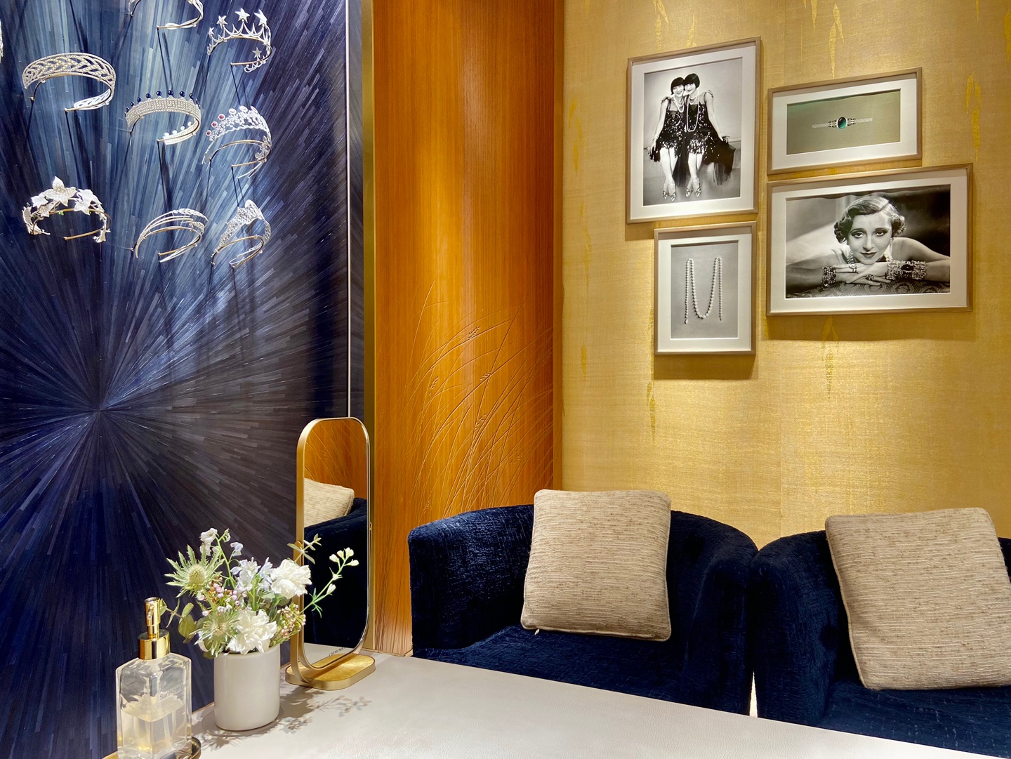 제가 본 쇼메 주얼리 중 팔찌가 예뻐보이더라구요. 목걸이는 하고 다니지 않지만 팔찌는 심플한 디자인으로 하고 다니면 좋을 것 같아서 나중에 기회가 된다면 팔찌 쇼핑을 하고 싶어요. 최근에 롯데백화점 에비뉴엘 본점에 있는 쇼메 매장에 들르게 되어서 매장 사진을 또 찍어봤어요. 같은 파란색 계열인데 벽면에 티아라가 장식 되어 있어서 또 다른 매력을 주는 공간이었어요. 당장 쇼핑할 계획이 아니더라도 관심이 있는 물건이라면 평소에 매장에 가서 구경하고 나에게 어울리는지 정말 갖고 싶은지 등 생각해보면 좋은 것 같습니다.