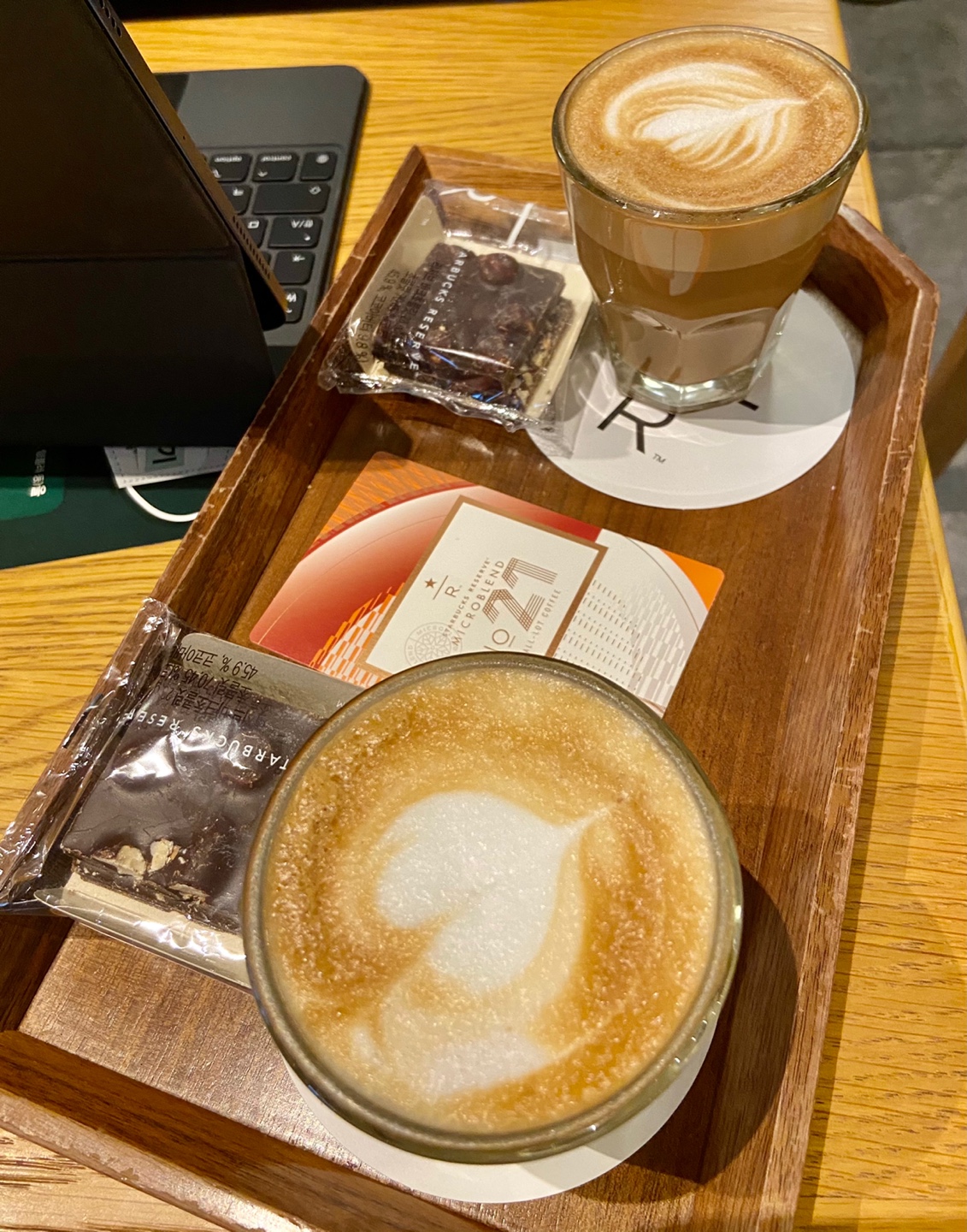 이번에 알게 되었는데 스타벅스 리저브 매장에서는 특히 블랙이글 머신이라는 하이엔드 급 에스프레소 머신으로 샷을 내려서 코르타도를 만들어 준다고 합니다. 커피 마시는 것을 즐기지만 커피에 대해 많이 알지는 못해요. 확실히 제가 아는 부분은 제게 있어 커피 한잔이 주는 편안함과 만족감이 생각보다 크다는 것입니다. 누구에게나 이렇게 포기하기 어려운 작은 즐거움의 한 부분이 있을 것입니다. 리저브 매장에서 작은 나무 쟁반에 놓인 코르타도 두 잔과 초콜릿을 마주 하면 기분이 좋아집니다. 리저브 매장을 특히 금요일 저녁이나 쉬는 날의 평일 오후에 방문했기에 더 여유로움을 느낄 수 있었던 듯 합니다. 커피도 맛있고 공간도 좋았다고 서로 이야기하며 리저브 매장을 나와서 남은 볼 일을 보고 저녁도 먹고 집으로 돌아왔습니다.