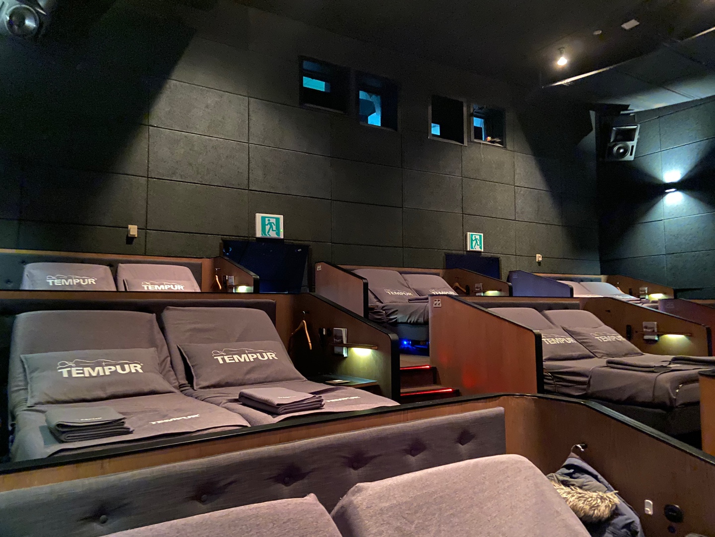 가서 보니 씨네드쉐프 식당은 크지 않은 규모였지만 깔끔한 화이트 톤의 공간이었어요. 영화관은 템퍼 시네마 또는 스트레스리스 시네마 중 고를 수 있습니다. 템퍼는 침대, 스트레스리스는 리클라이너 소파로 잘 알려진 브랜드여서 둘 다 편안한 영화 관람이 가능한 상영관입니다. 템퍼관은 들어가면 사진처럼 꾸며져 있어요. 상영관에 들어가기 전에 음료 하나씩 고를 수 있게 해줘요. 2인석이 하나의 관람석으로 되어 있고 템퍼 좌석 양쪽으로 물건을 놓을 수 있는 선반이 있어요. 옷걸이도 있고 담요, 초콜릿, 템퍼 할인권이 기본으로 준비 되어 있습니다. 저희가 조금 일찍 도착해서 아무도 없는 빈 상영관을 사진에 담을 수 있었어요. 기대 했던 것처럼 조명이 아늑하고 좌석도 편안한 공간이었습니다.