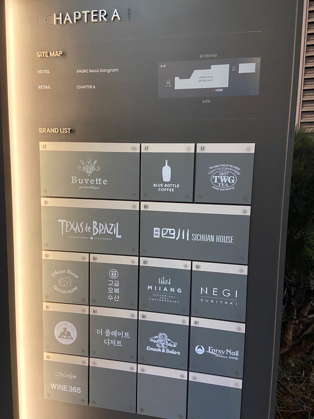 압구정 CGV가 위치가 좋은게 바로 근처에 안다즈 호텔이 있었어요. 호텔과 그 주변으로 맛있는 식당이 많아 보여서 다음 번에 씨네드쉐프를 가도 좋지만 여기 가도 좋겠다면서 남편과 즐거운 대화를 하면서 걸었어요. 안다즈 호텔 건물에 블루 보틀도 있고 1층에 너무 분위기가 예쁜 유럽 풍 식당이 보여서 찾아보니 Buvette라는 프렌치 레스토랑이었어요. 영화 보러 왔다가 주변 맛집 한군데 두군데 들러 보는 것도 좋겠단 생각이 들었습니다. 반포에 있는 텍사스 데 브라질 간판도 보이구요, TWG 매장이 깜깜한 밤에 불빛이 반짝 거려서 이쁘기도 했어요.