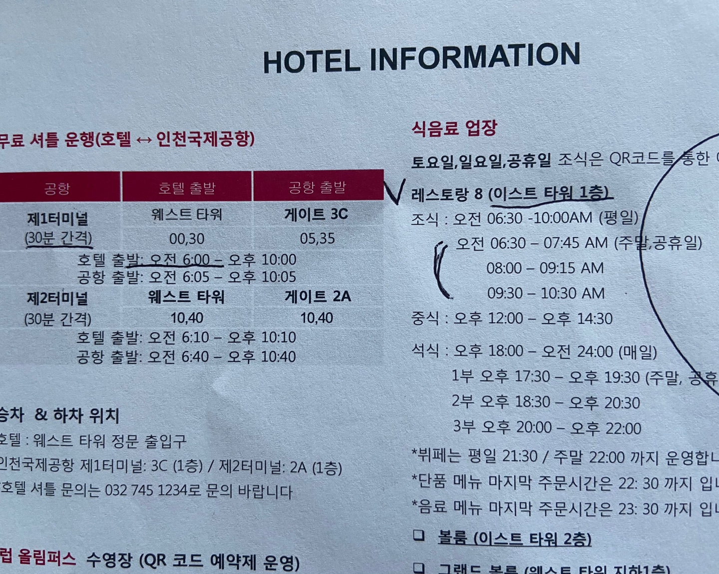 룸에서 시간을 좀 보내다 생각이 나서 QR코드로 접속을 하니 6시30분 시작인 시간을 제외하고는 이미 마감이 되었더라구요. 아쉬운 마음이었지만 조식 먹는 김에 일찍 일어나자 생각하고 6시30분 시작 시간으로 예약을 했어요. 체크인할 때 아래와 같이 안내 사항을 주는데 공항 셔틀 버스랑 조식 등 잘 설명되어 있어요. 저희는 수영장을 사용하지 않았는데 수영장 이용도 미리 예약을 하도록 되어 있었어요.