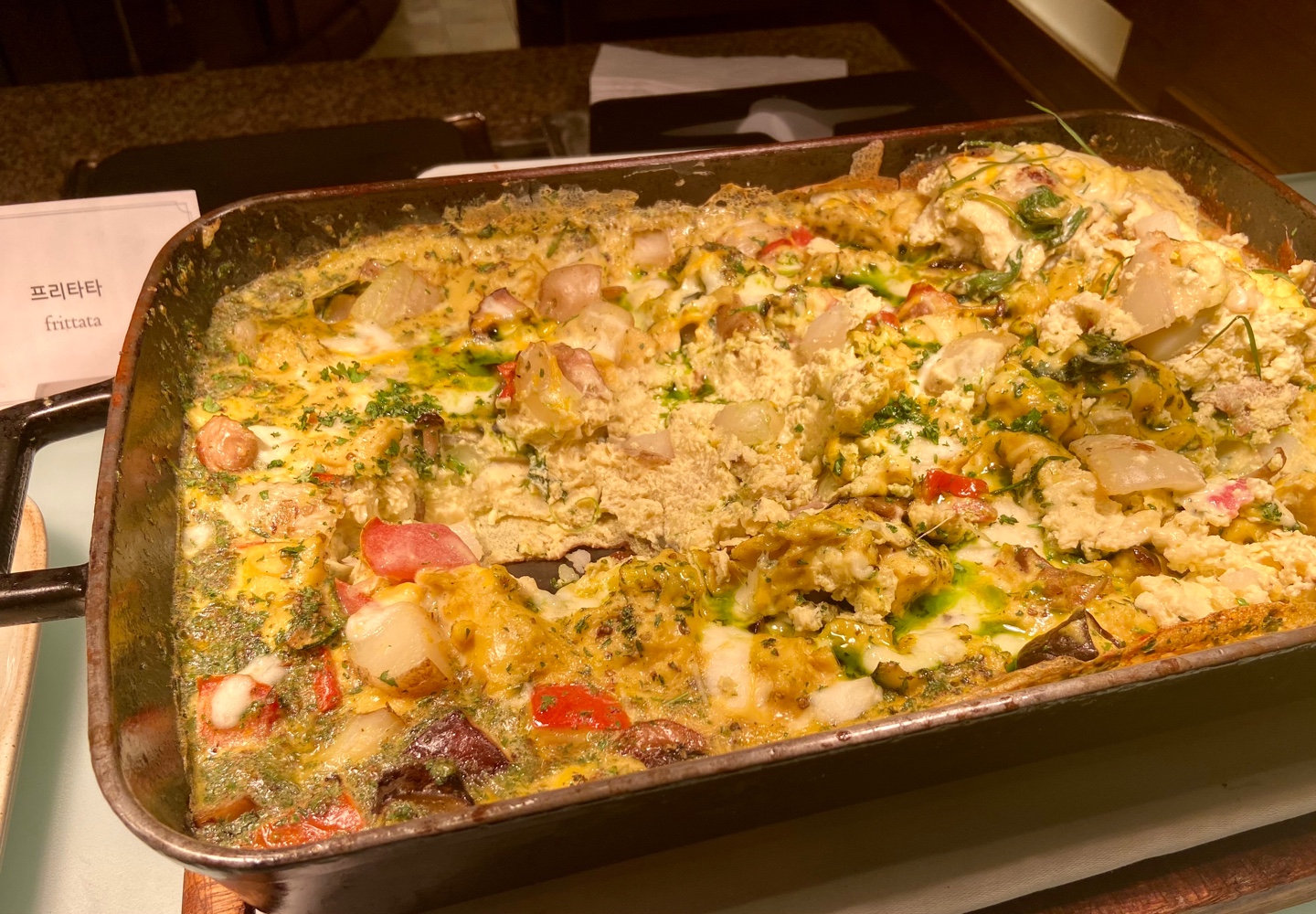 이번에 예약한 호텔 패키지에 레이트 체크아웃이 포함되어 있어서 편안한 아침 시간을 보낼 수 있었습니다. 하얏트 조식 뷔페에서 가장 맛있게 먹었던 음식이 프리타타였어요. 잠이 약간 덜 깬 상태로 한 입 먹었는데 너무 맛있어서 또 가져다 먹었어요. 어떤 재료에서 그런 맛이 났는지 모르겠는데 감칠맛이라고 해야 할지 고소한 뒷맛이 느껴졌어요.