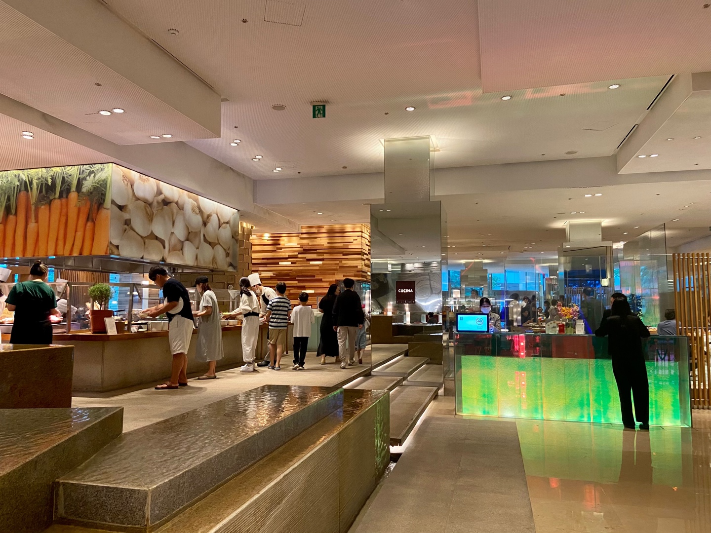 사진 오른쪽의 연두색 데스크가 입구입니다. 식당 한 가운데 소시지, 베이컨, 계란 류를 담을 수 있는 바가 있어요. 식당이 굉장히 넓은 편이고 군데 군데 계단이 있어서 접시 들고 다닐 때 조심하게 되더라구요. 널찍한 점이 마음에 들었지만 다양한 음식들이 한 눈에 다 보이지 않아서 처음 방문인 저희는 우선 어디에 무엇이 있는지 한번 둘러보았어요.