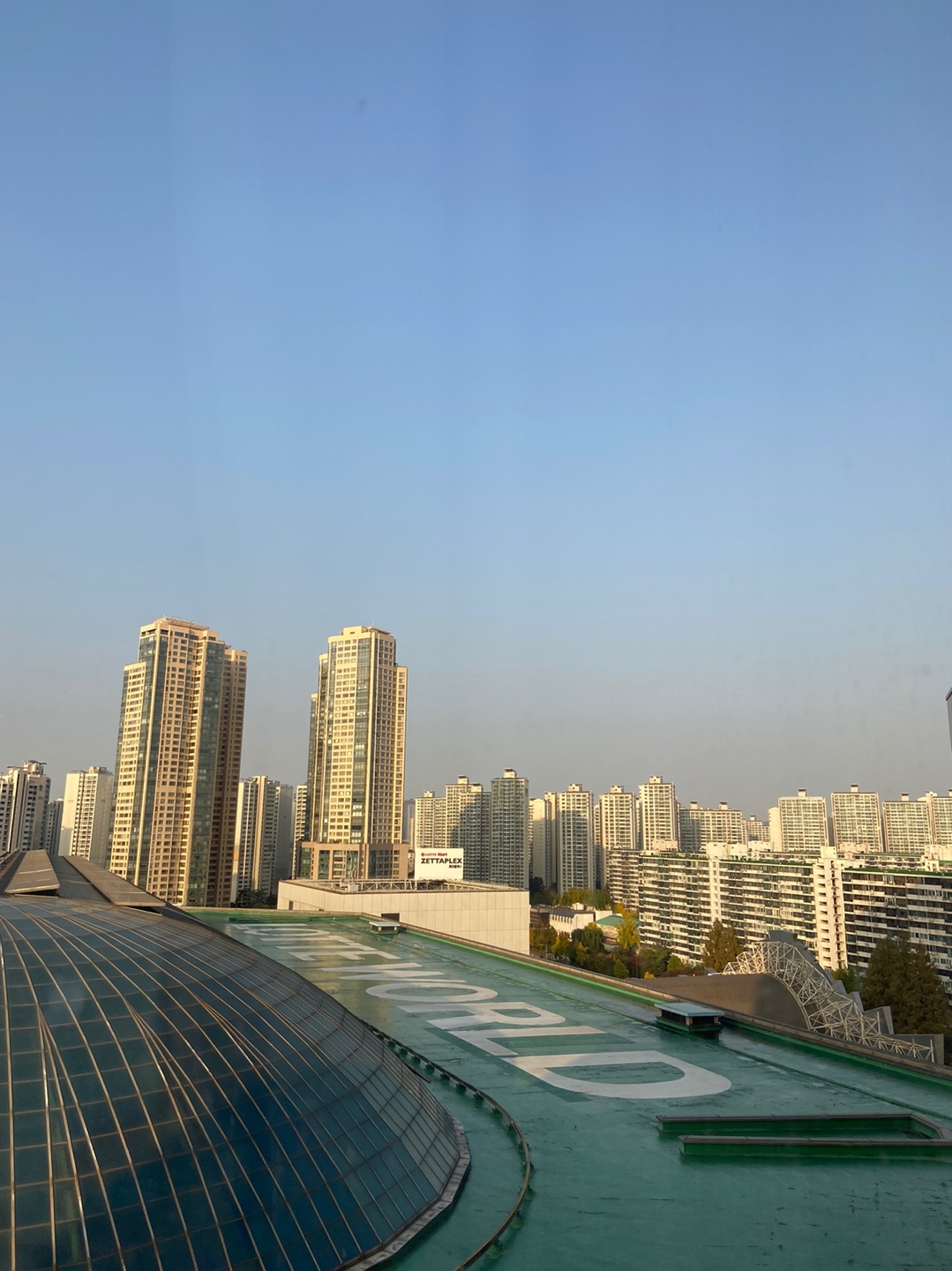 룸에 들어가서 가방을 놓고선 침구와 욕실을 사진에 담아 보았습니다. 친환경으로 샴푸, 바디로션 등의 어메니티도 1회용이 아니에요. 어메니티에 예민한 편은 아니어서 잘 사용하였고 칫솔을 따로 챙겨야 하는 것은 늘 느끼지만 조금 불편하기는 합니다. 룸에서 창 밖을 보면 롯데월드의 옥상이 보이고 저 멀리 아파트 단지도 보여요. 시야가 탁 트여서 저는 이런 시티뷰도 좋았습니다.