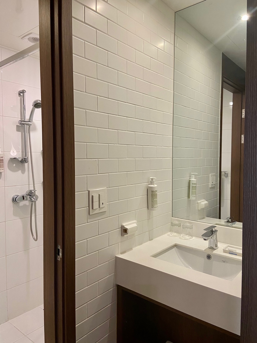 룸에 들어서면 사진에 보이듯 거실이 보이고 입구 쪽에 작은 욕실이 있어요. 욕조 없는 샤워 부스가 갖춰진 욕실로 세면대가 밖에 배치되어 있어서 사용이 편리해요. 욕실이 두 개 있어서 방 안에 큰 욕실이 위치해 있습니다. 용도가 다른 욕실 두개가 있어서 묵을 때 편해요. 지하에 사우나가 있어서 사우나를 꼭 한번씩 가기도 해요.